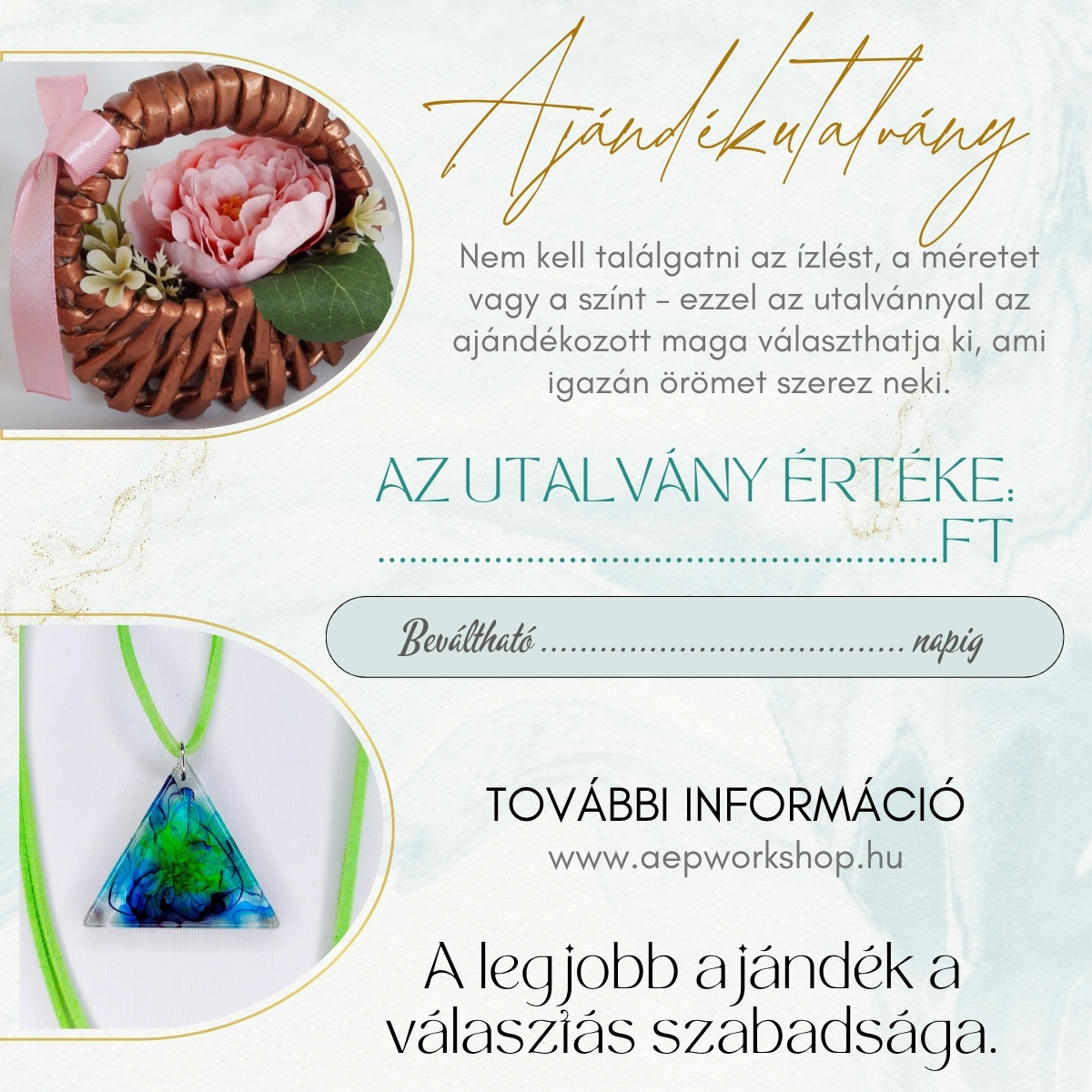 Szeretnél örömet szerezni, de nem vagy biztos benne, melyik termék tetszene a legjobban? Ajándékutalványunkkal nem kell találgatni – a megajándékozott maga választhatja ki kedvenc kézműves alkotását, így biztosan olyan ajándékot kap, amit igazán szeretni fog. Legyen szó születésnapról, névnapról, karácsonyról, anyák napjáról vagy akár egy kis „csak úgy” meglepetésről, az ajándékutalvány mindig elegáns, mégis személyes megoldás. Engedd, hogy a választás öröme is része legyen az ajándéknak!